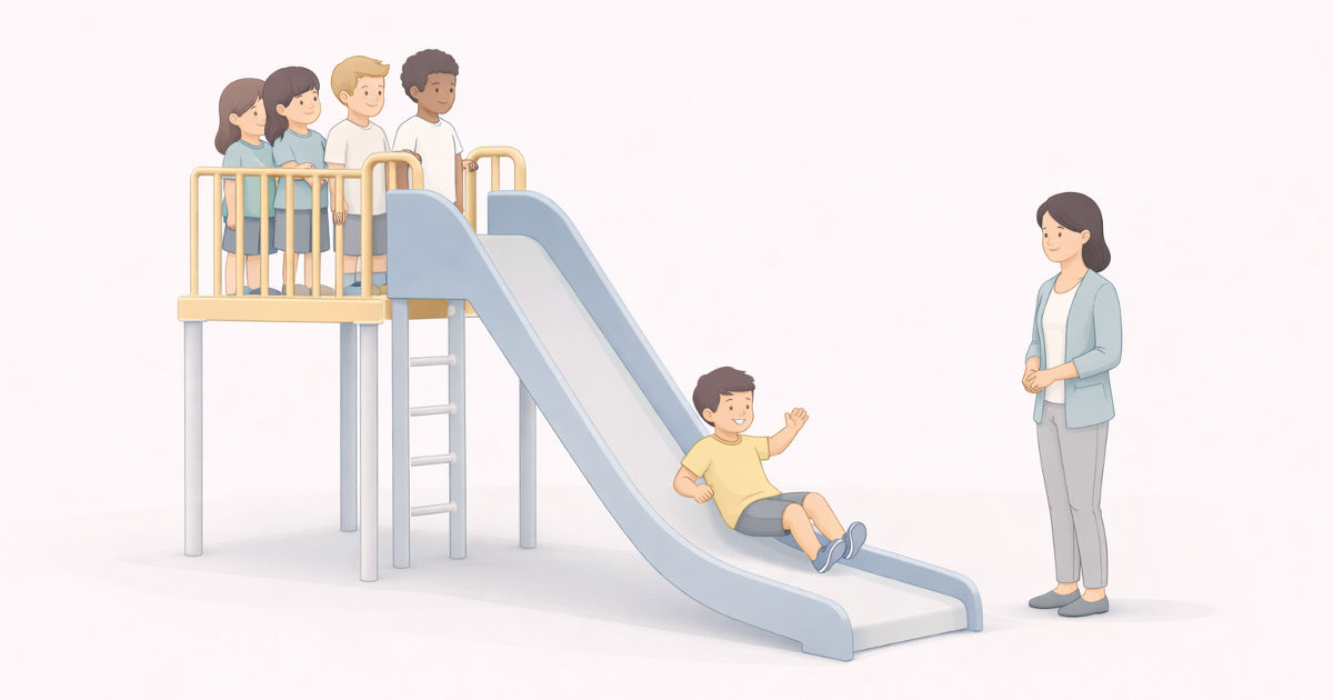 You can’t push everyone at once and go zoom‑zoom‑zoom together. The slide would break. Kids would crash. Someone would cry.